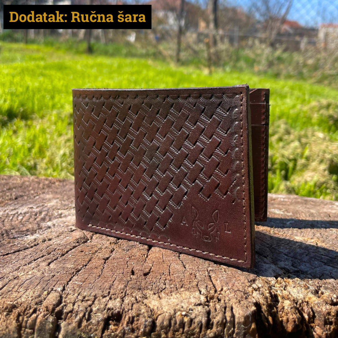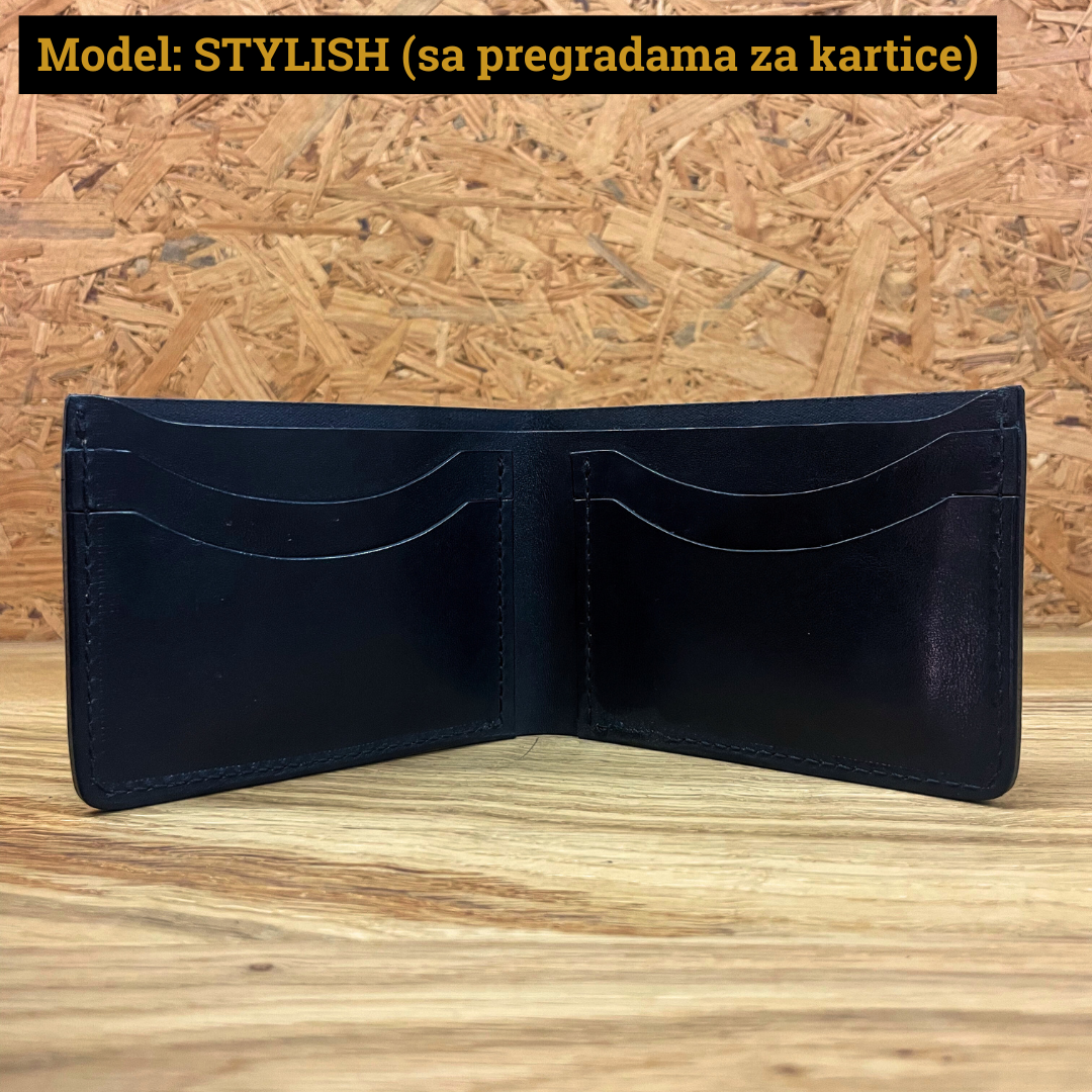 Novčanik STYLISH je elegantan i funkcionalan komad opreme, ručno izrađen od 100% prirodne kože. Ovaj novčanik nudi dovoljno prostora za vaše kartice, gotovinu i dokumente, uz moderan dizajn koji je savršen za svakodnevnu upotrebu. Kvalitetna koža i precizna izrada garantuju dugotrajnost i izdržljivost, dok njegova kompaktnost omogućava jednostavno nošenje u bilo kojem džepu ili torbi.